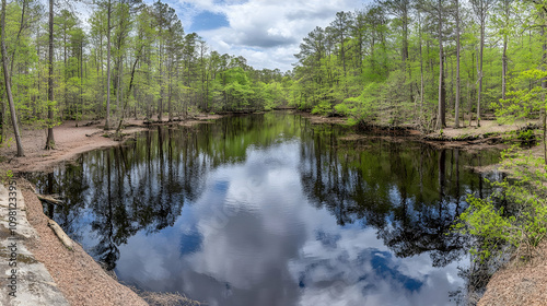 © GontaGanti, Obraz premium Serene Spring River Reflection Photo