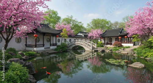 Obraz premium Serene Spring Scene in a Traditional Garden with Cherry Blossoms and Bridge