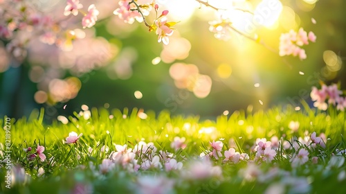 © SprintZz, Obraz premium Serene Spring Scene with Blooming Cherry Blossoms, Green Grass, and Sunny Skies