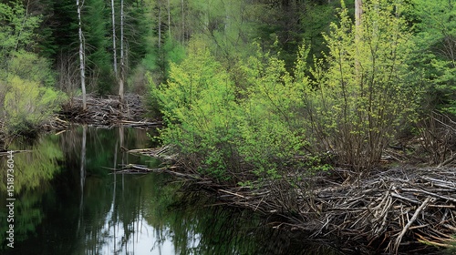 © Setia Fitra, Fototapeta premium Serene Springtime Beaver Dam in Lush Forest Pond Reflecting Trees