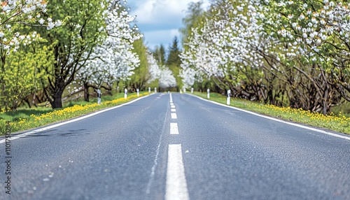 © Philipp, Fototapeta premium Serene springtime countryside road framed by lush, blooming trees in full blossom