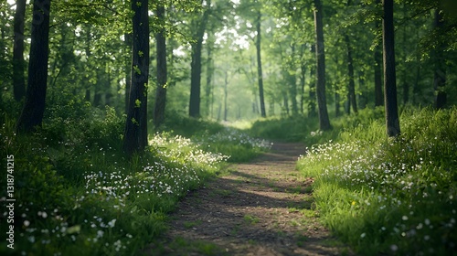 Fototapeta premium Serene Springtime Forest Trail with Bright Green Buds and Delicate Wildflowers in Sunlit Pathway