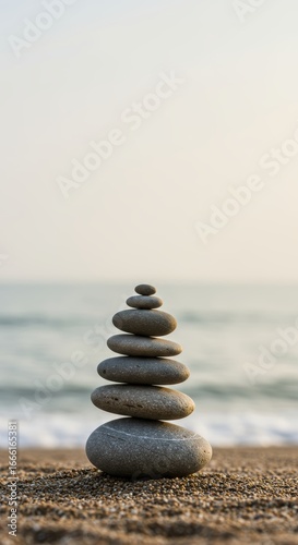 Fototapeta premium Serene Stacked Stones on Beach at Sunset A Symbol of Balance and Tranquility