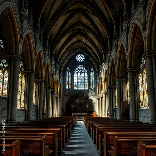 © Flop, Fototapeta premium Serene Stained Glass Church Interior with Warm Light