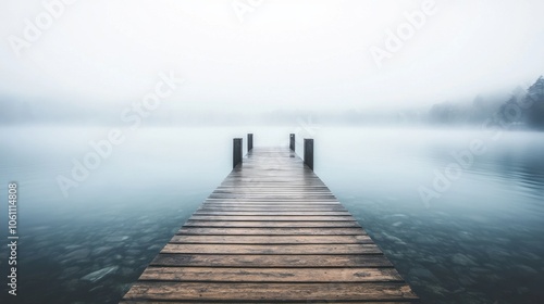 © JH45, Fototapeta premium Serene Stillness: A Misty Lake Dock Beckons Tranquility
