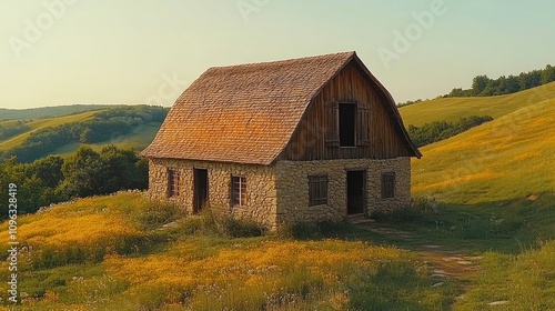 Obraz premium Serene Stone Barn on Rolling Hills