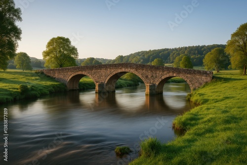 © Kitta Studio, Fototapeta premium Serene Stone Bridge Over Calm River Amidst Lush Greenery