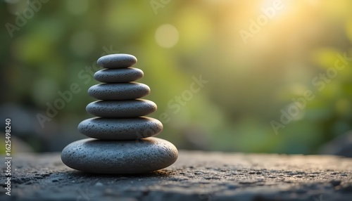 © DiditEko, Obraz premium Serene Stone Cairn: Balanced Pebbles in Soft Sunlight, Nature's Harmony