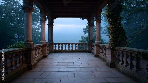 © Thares2020, Obraz premium Serene stone veranda with ornate columns and balustrade overlooking a misty landscape at twilight