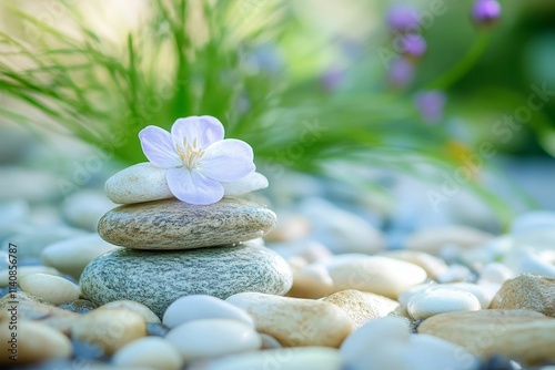 © jambulart, Fototapeta premium Serene stones, delicate flower, tranquil garden setting.