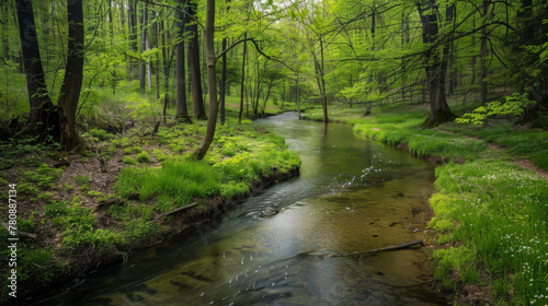 Fototapeta premium Serene stream flows through a lush springtime forest with vibrant green foliage