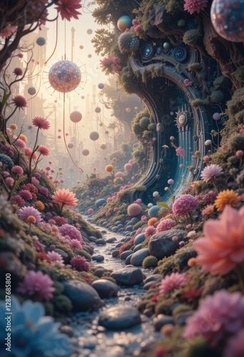 © Ai DreamscapesTH, Obraz premium Serene Stream Flows Through a Magical Flower Garden Past Futuristic Architecture