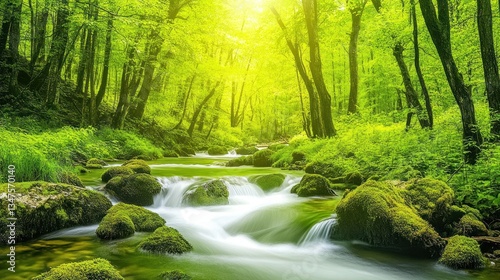 © Gerbang, Obraz premium Serene Stream in Lush Forest