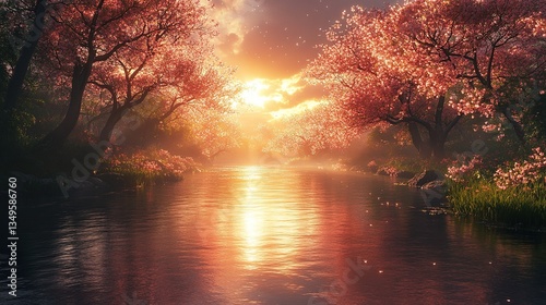 © cik, Obraz premium Serene stream reflects sunset with blooming cherry trees along the riverbanks