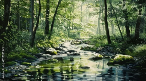 © Mahavira Osa, Fototapeta premium Serene Stream Through a Sun-Dappled Forest