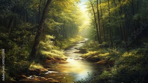 © Winarsih, Fototapeta premium Serene Stream Winding Through a Sun-Dappled Forest