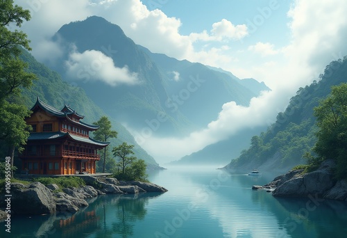 Fototapeta premium Serene Study by Misty Mountain: Children Reading and Playing Near Clear...