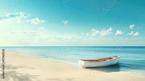 Naklejka premium Serene Summer Beach Escape with Tranquil Blue Waters, White Sand, and a Vintage Boat Anchored Under Soft Cloudy Skies