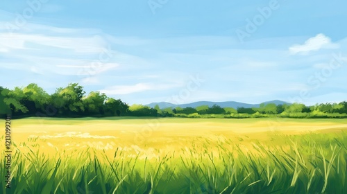 © HeriAfrilianto, Obraz premium Serene Summer Field Landscape Under Blue Sky