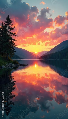 © Hugnaka, Obraz premium Serene summer lake scene at sunset Calm water reflects the warm colors of the sky Ideal for travel, nature, and vacation themes , majestic, mountains