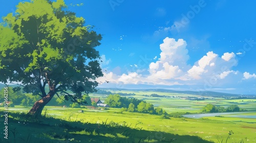 Obraz premium Serene Summer Landscape with Lush Green Fields and Blue Sky