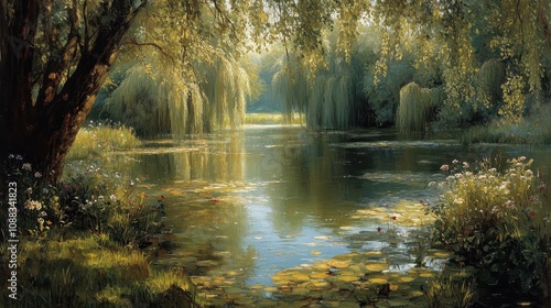 Fototapeta premium Serene Summer Landscape with Lush Greenery and Tranquil Pond Reflecting Sunlight in a Peaceful Natural Setting