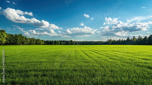 © supardi, Fototapeta premium Serene Summer Meadow: A Vibrant Green Field Under a Blue Sky