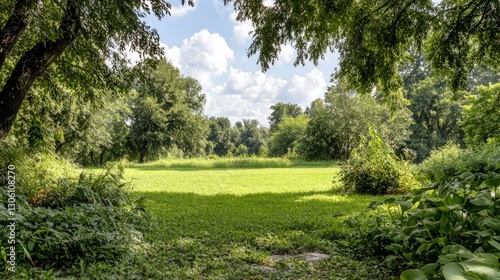 © Oat_Photo, Obraz premium Serene Summer Meadow Landscape Green Grass Lush Trees Sunny Sky