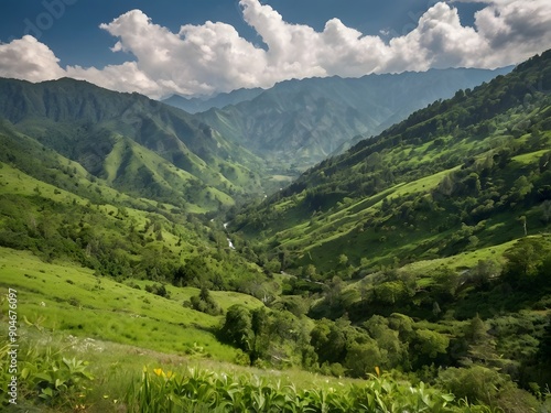 © Sokimimi Studio, Naklejka premium Serene summer mountainscape veiled in ethereal clouds