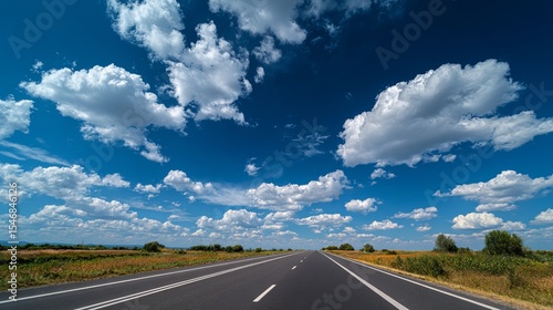 Fototapeta premium Serene Summer Road Trip Ahead Blue Sky Fluffy Clouds Sunny Asphalt Highway