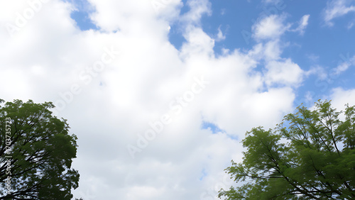 Obraz premium Serene Summer Sky: Lush Green Tree Branches Frame Bright White Clouds and Blue Sky; Peaceful Nature Background