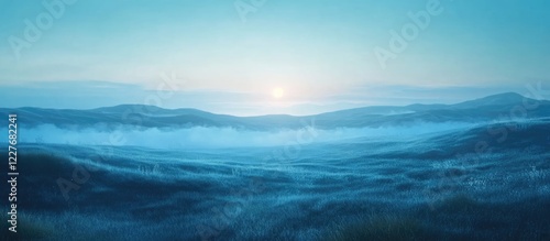 © AbstractAI, Fototapeta premium Serene summer tundra landscape with blue fog-covered hills and a soft morning sun creating vast empty space for text or captions.
