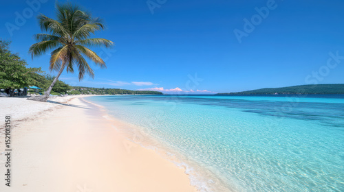 Fototapeta premium Serene sun soaked beach with clear turquoise waters and gentle palm trees...