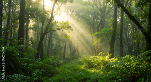 Obraz premium Serene Sunbeams Illuminating Lush Green Forest Path: Mystical, Tranquil Morning Atmosphere