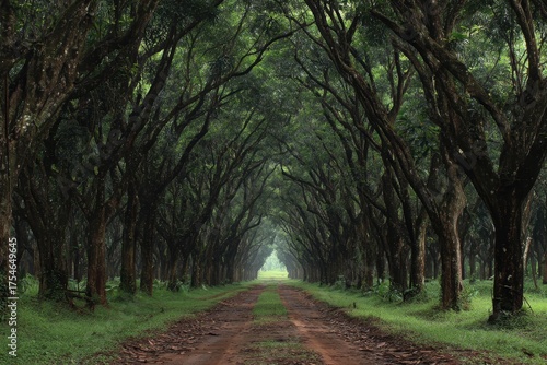 Fototapeta premium Serene Sunday Drive: Emptiness of a Tranquil Road Through Exotic Rubber Tree Plantation