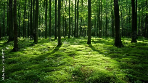 Naklejka premium Serene Sunlight Dappled Mossy Forest Floor