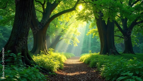 © Yapa, Naklejka premium Serene Sunlight Dapples Ancient Forest Discover Untamed Natures Vibrant Green Beauty