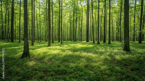 Fototapeta premium Serene Sunlight Filtering Through a Lush Green Forest Canopy