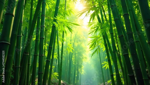 © Jiran, Fototapeta premium Serene Sunlight Filtering Through Lush Bamboo Grove Peaceful Asian Nature Scene