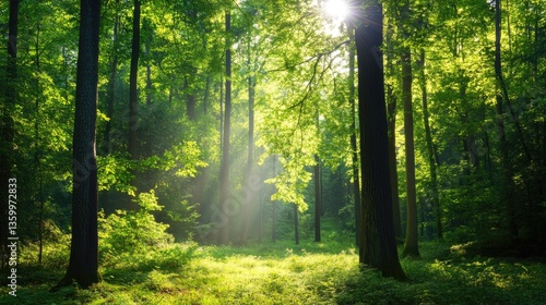 Obraz premium Serene Sunlight Filtering Through Lush Green Forest Canopy