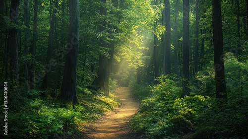 © Kitta Studio, Obraz premium Serene Sunlight Filtering Through Lush Green Forest Pathway