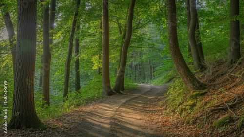 Obraz premium Serene sunlight filtering through lush green forest trees along a winding...