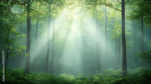 Fototapeta premium Serene sunlight filtering through lush green forest trees creating a tranquil...