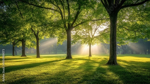Fototapeta premium Serene Sunlight Filtering Through Lush Green Trees