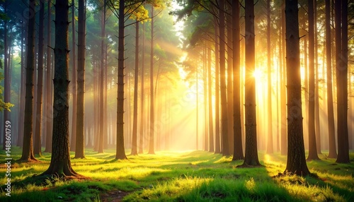 © KAMOLPOP, Fototapeta premium Serene Sunlight Filtering Through Tall Trees in a Lush Green Forest at Dawn