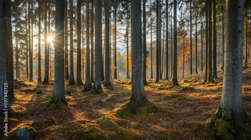 Fototapeta premium Serene Sunlight Filtering Through Tall Trees in Autumn Forest