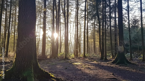 Naklejka premium Serene Sunlight Filtering Through Trees in a Peaceful Forest Scene