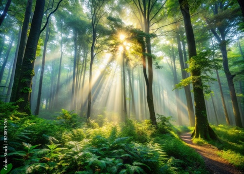 Fototapeta premium Serene sunlight filters through dense foliage, illuminating misty forest...