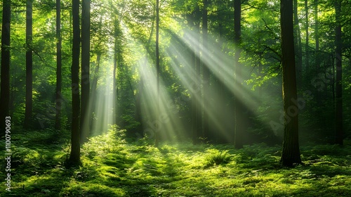 Fototapeta premium Serene sunlight streams through a lush green forest, creating a tranquil...