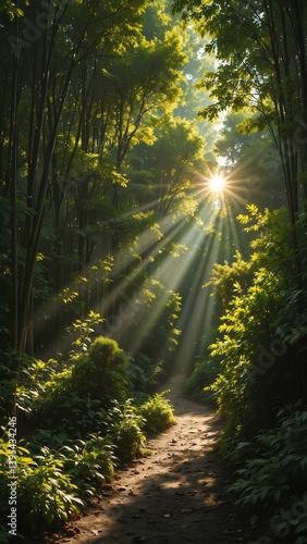 © S@photo, Fototapeta premium Serene Sunlight Through Bamboo Forest Path at Sunrise